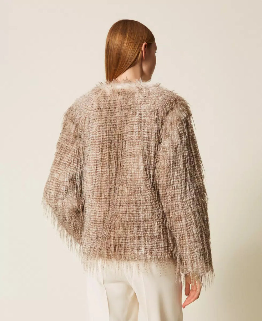 Giacca corta collezione Actitude in pelliccia sintetica lunga effetto struzzo con stampa sfumata. Ha scollo tondo, chiusura con ganci davanti, tasche inserite ai fianchi, fodera interna e linea dritta.