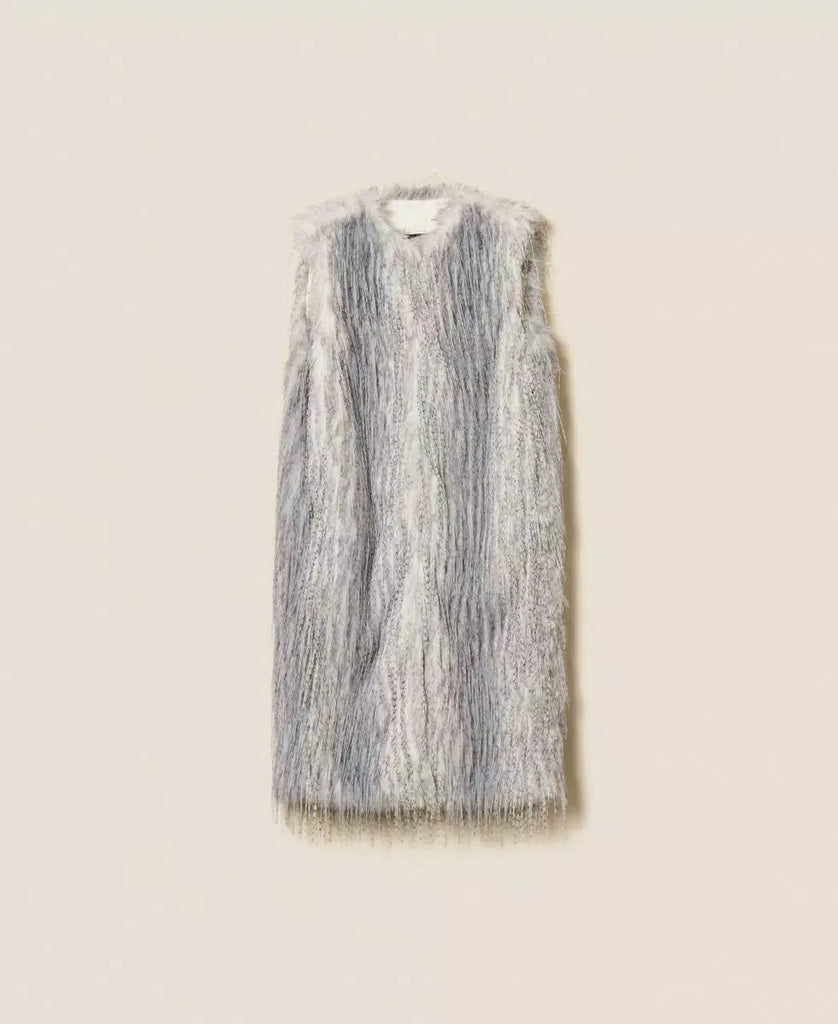Gilet lungo collezione Actitude in pelliccia sintetica lunga effetto struzzo con stampa sfumata. Ha chiusura con ganci davanti, tasche inserite ai fianchi e fodera interna, linea dritta.