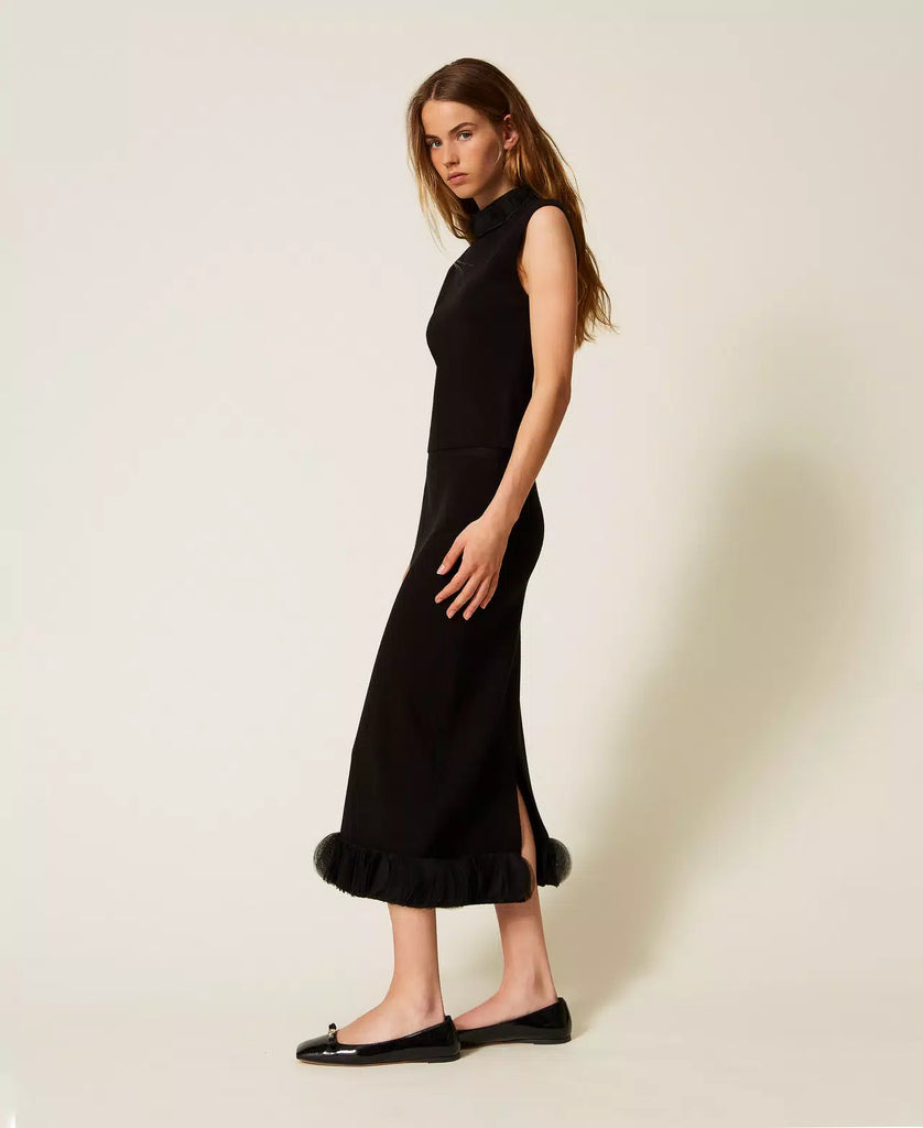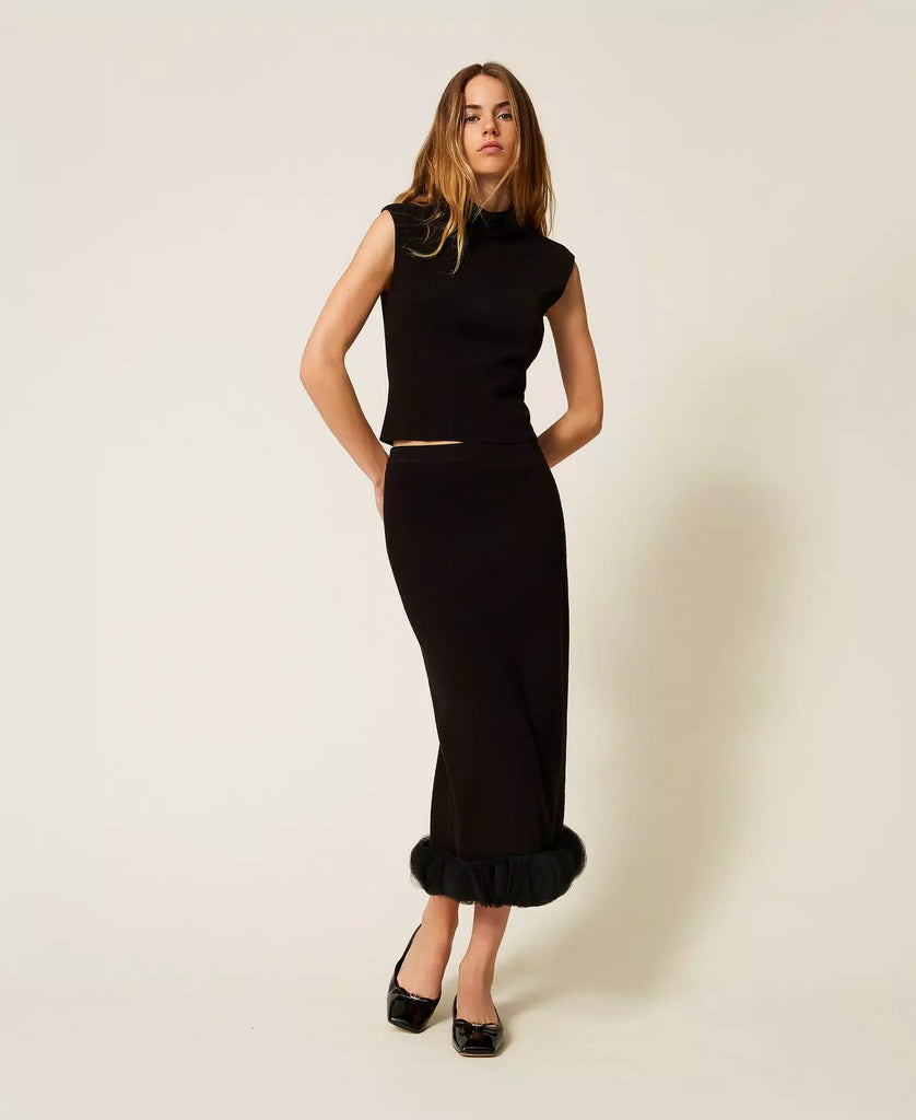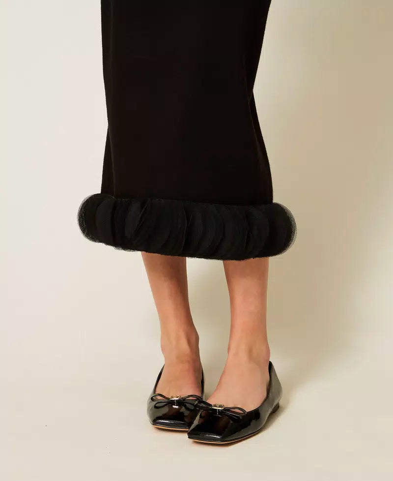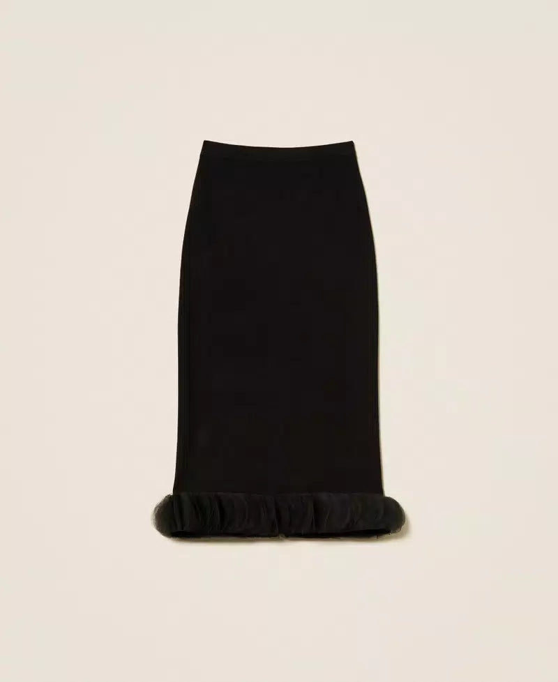 Gonna longuette collezione Actitude in maglia con applicazione di dischi in organza rimovibili al fondo e placchetta logo sul retro, linea dritta.
